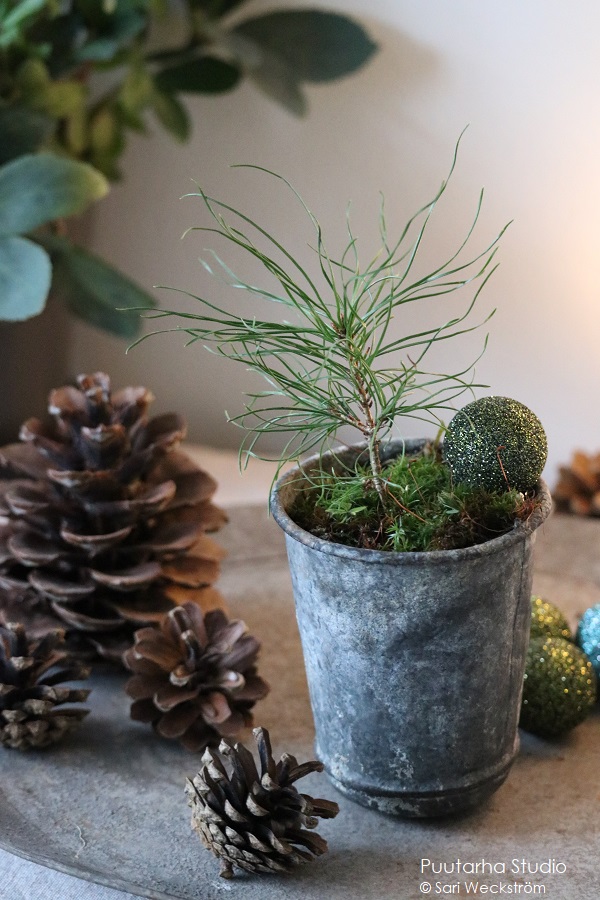 Tästä pienestä minimännystä sai helpolla jouluisen joulupuun, kun laittoi ympärille männynkäpyjä ja pieniä joulupalloja.