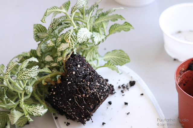 Syksyn pistokastaimet saavat vielä olla vanhoissa ruukuissaan. Niillä ei ole mikään kiire. Sen huomaa jo siitä, että juuria on näin vähän näkyvissä. Vaalea multapaakun pinnalla on sanomalehden pala. Laitan nimittäin aina mullanvaihdossa paperinpalan ruukun pohjalle, niin multaa ei karise ruukun rei´istä pöydälle. Siis siistimpää hommaa.