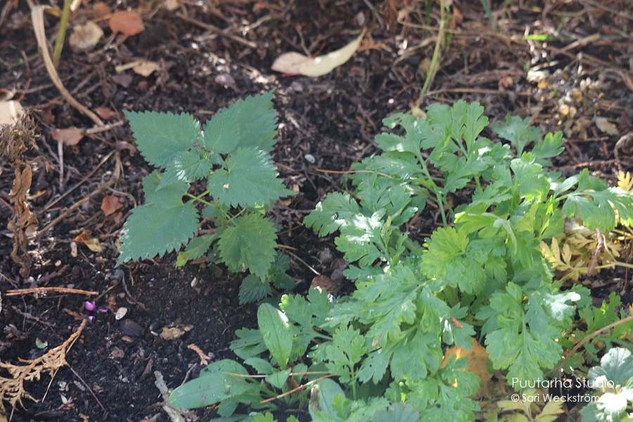 Aika paljon vielä vihreää kukkapenkeissä näin lokakuun lopulla täällä eteläisessä Suomessa. Tähänkin penkkiin on lisätty pieni kerros kompostimultaa.