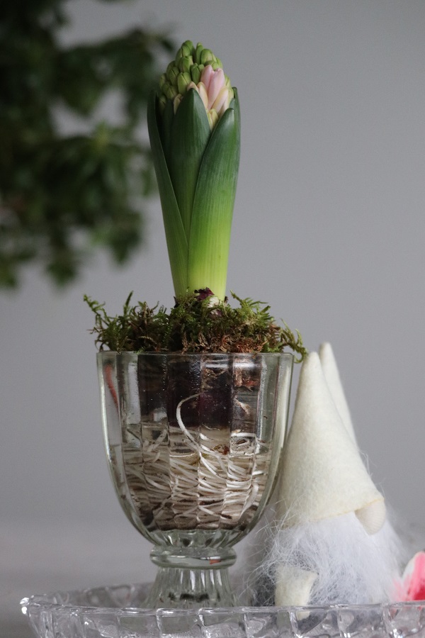 Hyasintin juuripaakusta on helppo käsin poistaa suurin osa mullasta. Tällä kertaa en pessyt hyasintin juuria, vaan laitoin ne suoraan näihin lasikippoihin. Lisäsin hieman sammalta sipulin ympärille tuomaan lisää luonnollista vihreyttä. Sammal myös tukee sipulia, jolloin kukkiva hyasintti pysyy varmasti pystyssä. Lopuksi kaadoin vettä lasikippojen pohjalle.
